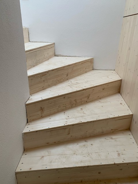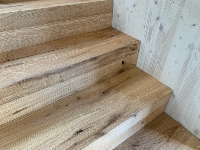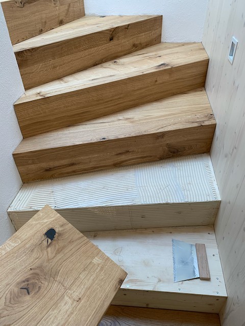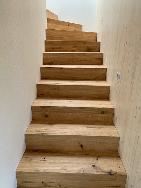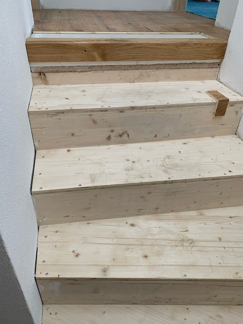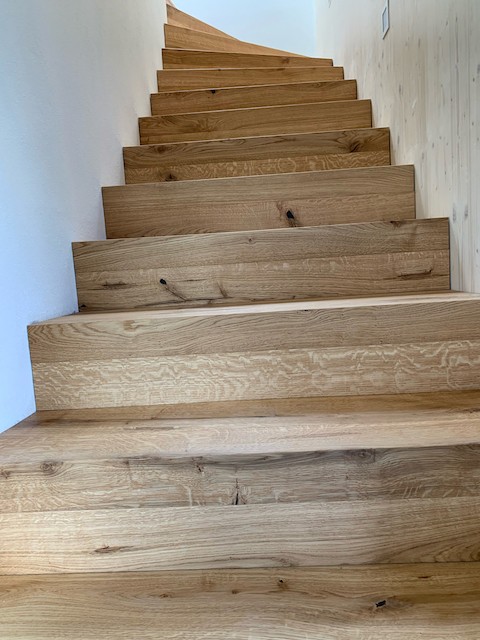 In diesem Neubau in Werthenstein durften wir die Bodenbelagsarbeiten ausführen. Der Bauherr hat sich hier für ein wunderschönen rustikalen Eichenholzparkett mit Wohnfertig geölter Oberfläche von Sabag entschieden. Dabei wurden neben dem Wohnzimmer, Esszimmer und Zimmer auch die 1/4 gewandelte Treppe mit Parkett belegt. Dafür haben wir vorgängig die Treppenkanten bei uns in der Werkstatt aus dem Parkett angefertigt. Auf dem Bau konnten wir dann die Formen der einzelnen Treppentritte noch auf den Parkett übertragen und fertig montieren. Beim Zuschnitt war dabei besondere Sorgfalt geboten, da als seitliche Abschlüsse lediglich eine feine Kittfuge vorgesehen war.