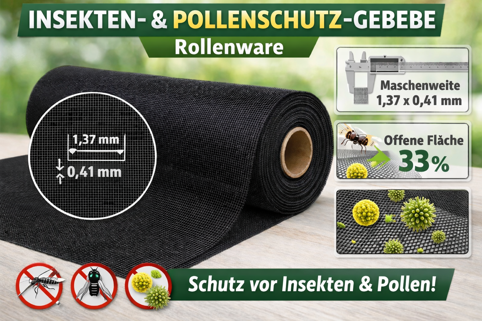 Eine kostengünstige Alternative, welche die Pollen zu fast 100%, und sogar feinen Blütenstaub zu über 90% erfolgreich abwehrt. Die schwarze Farbe des Gewebes gewährt eine gute Durchsicht.