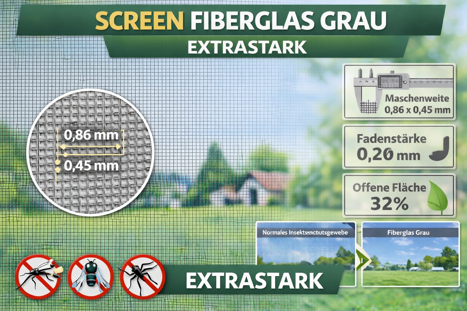 Extra starkes Fiberglasgewebe mit Kunststoffummantelung. Durch die UV-Stabilisierung erhält das Gewebe eine extra lange Haltbarkeit. Fiberglasgewebe Rollenware für alle gängigen Insektenschutzsysteme geeignet. Ideal als ersatz von bestehenden Gewebe zum neu bespannen von Insektenschutzspannrahmen, Schieberahmen, Drehtüren oder Pendeltüren.