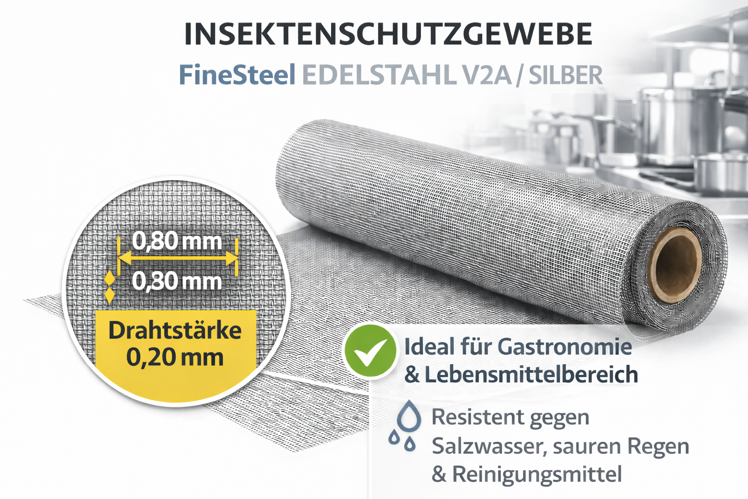 Das FineSteel Insektenschutzgewebe aus Edelstahl V2A ist ein besonders feinmaschiges und robustes Metallgewebe für professionelle Anwendungen. Durch die kleine Maschenweite bietet es einen erhöhten Schutz vor kleineren Insekten, während die Luftzirkulation weiterhin sehr gut erhalten bleibt.